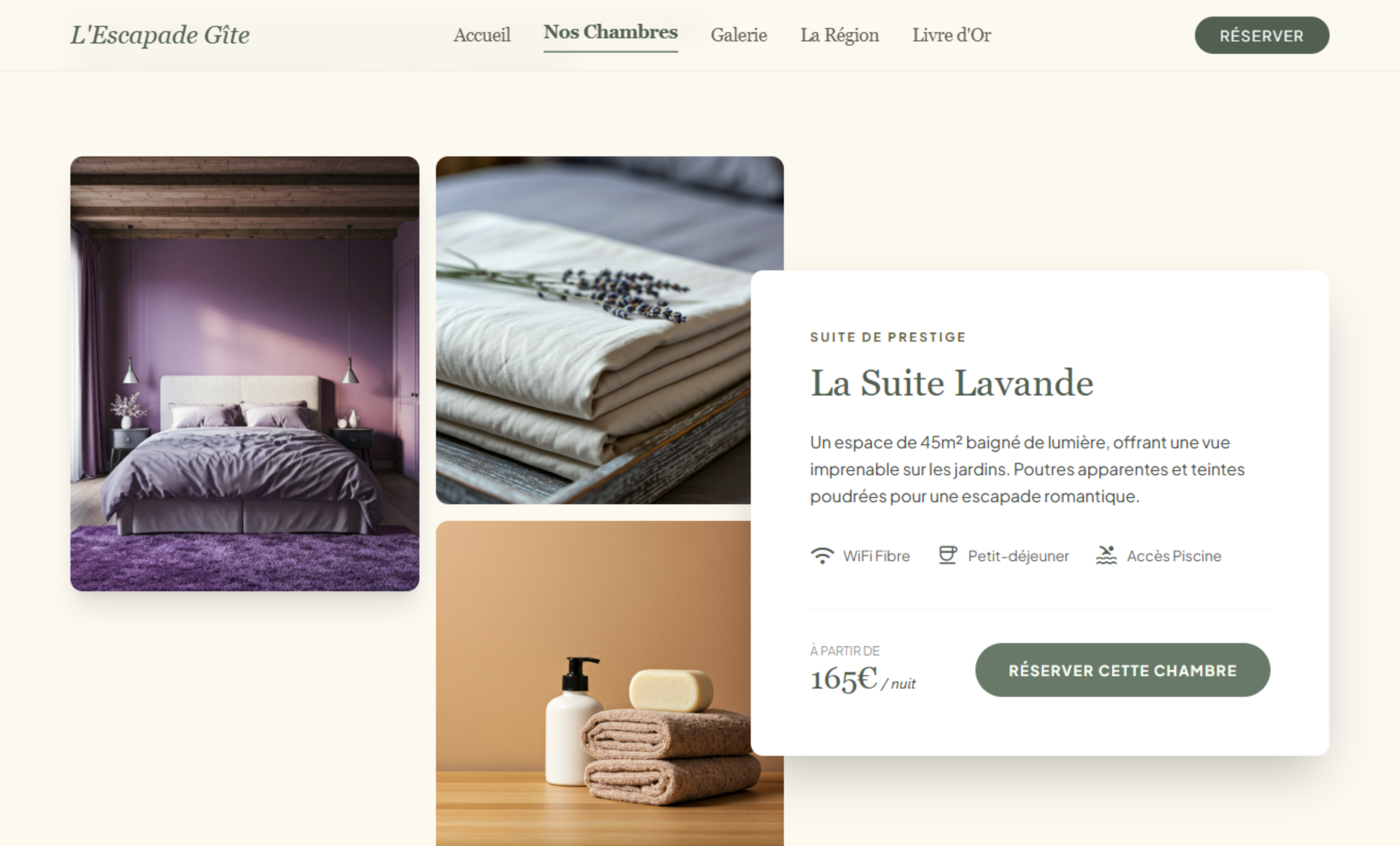 Sur les plateformes, votre gîte est réduit à quelques photos et une description standardisée. Sur votre site, vous racontez votre histoire, montrez l'ambiance, partagez les activités autour.