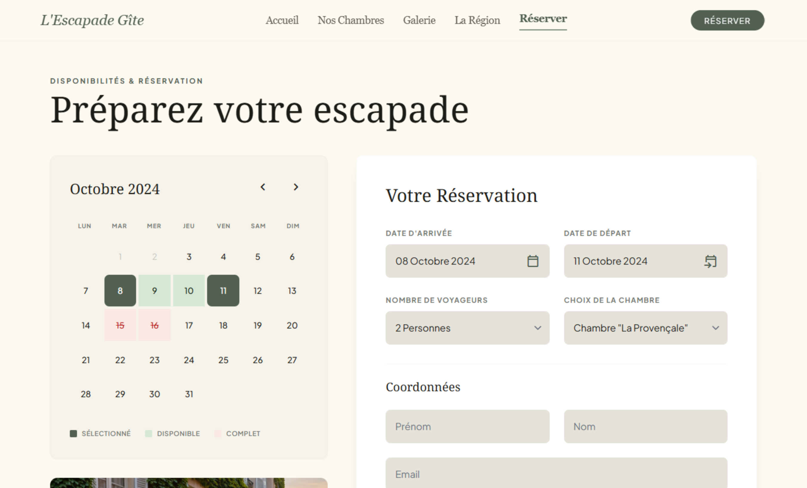 Calendrier de disponibilités en temps réel, paiement sécurisé par carte, confirmation automatique par email. Vos clients réservent en 2 minutes, 24h/24.